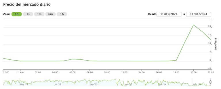 El mercado mayorista diario en España registra horas con precios negativos por megavatio hora
