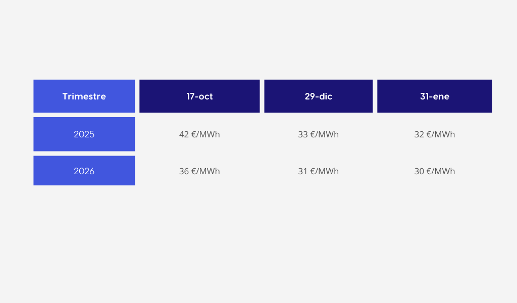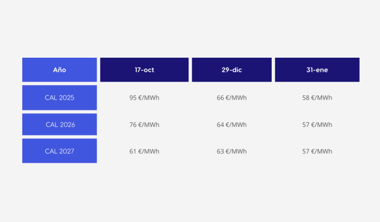 A nivel anual los precios han tenido un comportamiento similar y la caída se traduce en un 30% para el 2025, convergiendo los precios en valores cercanos a los 60 €/MWh para los próximos años.