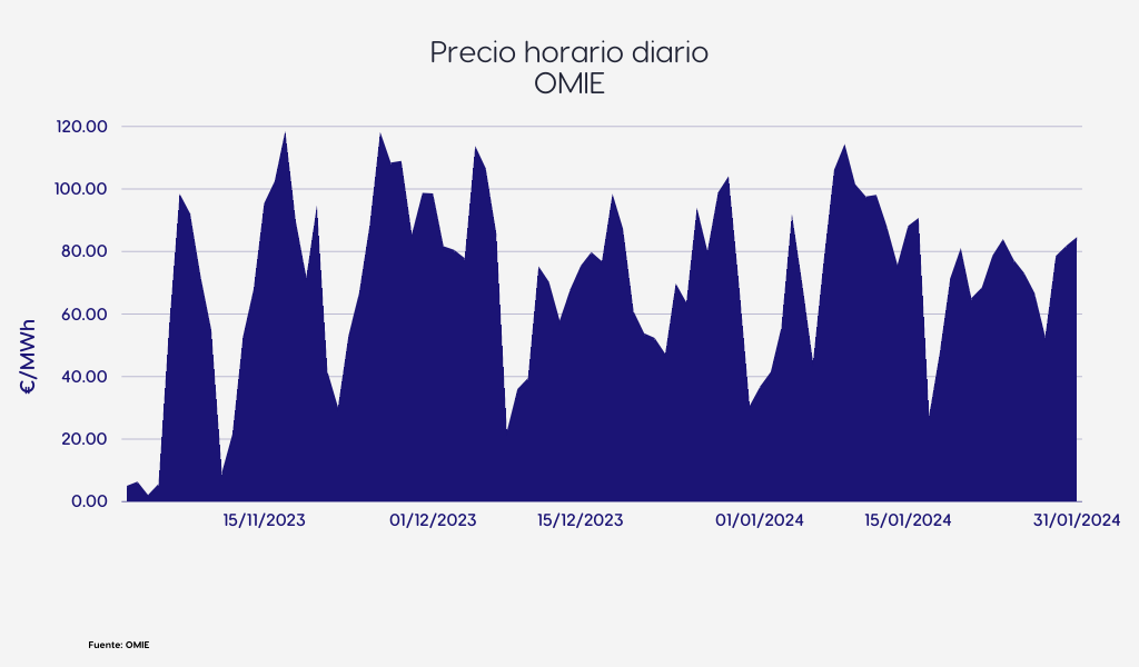 El Informe Mercado Energético Enero 2024, muestra como el precio de la electricidad durante este mes ha sido de 74.1 €/MWh. Durante los últimos tres meses, podemos afirmar que los precios se estabilizan en torno los 70 €/MWh, se confirma el cambio de tendencia iniciado a mediados de octubre:
