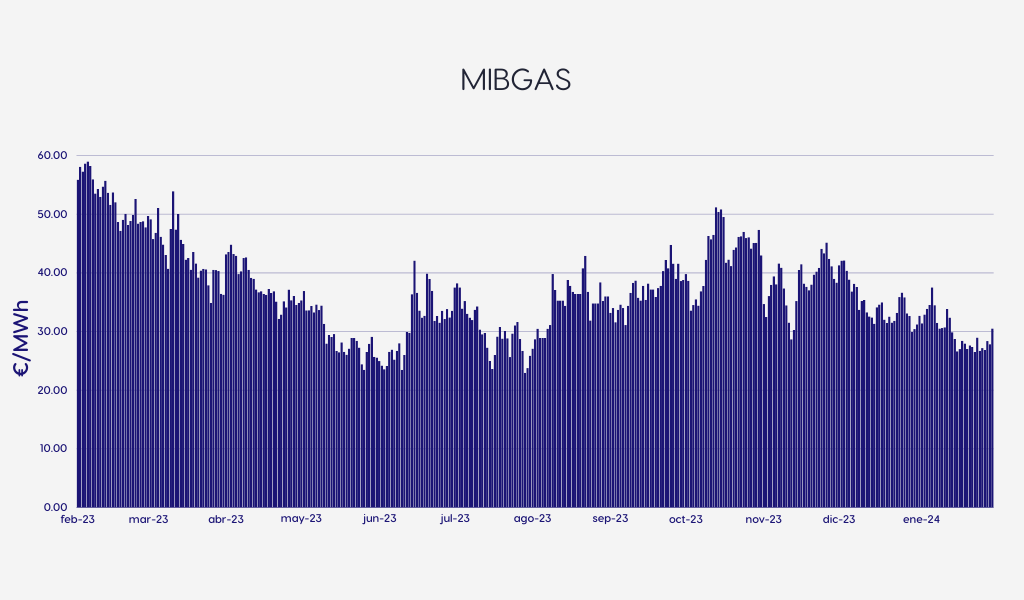 El precio medio del gas (MIBGAS) ha cerrado el mes de enero con un precio medio de 30 €/MWh, este valor es el mínimo desde junio del 2021 y se traduce en un descenso del 15% respecto a diciembre y sus respectivos 35.5 €/MWh.
