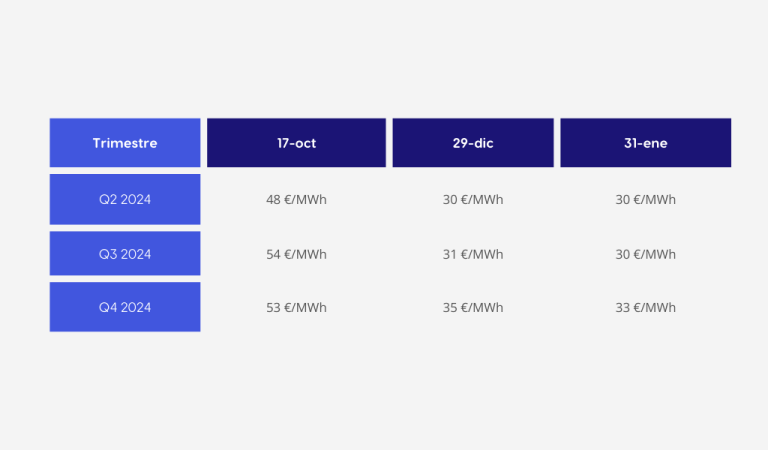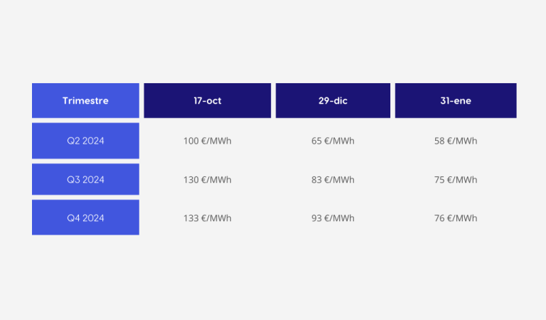 Así podemos observar un descenso de casi un 50% de los precios a futuros de la electricidad para España en los últimos tres meses, con valores de 58, 75 y 76 €/MWh para los próximos 3 trimestres.