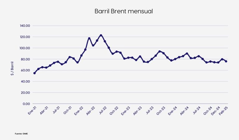 El precio del Brent se ha situado en 75,7 $/barril en febrero. Se espera que esta tendencia bajista continúe, con previsiones en el rango de 70-73 $/barril.