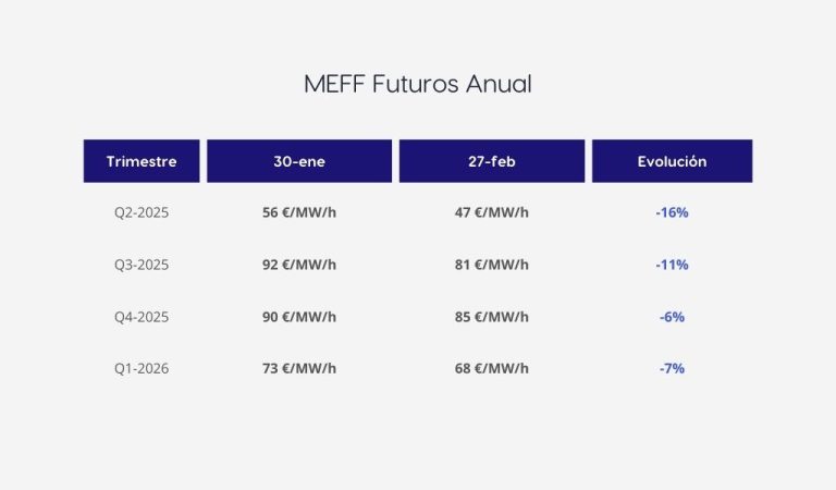 Los precios a futuro de la electricidad van a experimentar una caída del 10 %, registrando 47 €/MWh para el próximo trimestre. Para 2026 y 2027, se estiman unos precios aproximados a 61 €/MWh y 57 €/MWh, respectivamente.