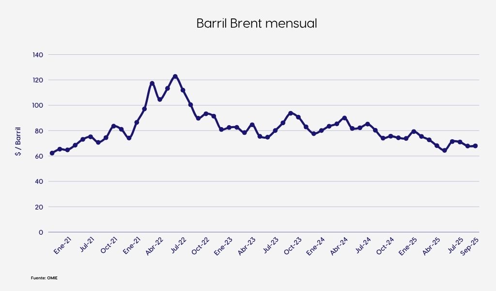 El precio medio del Brent fue de 74,1 $/barril, con una caída mensual del 7,7 % y una bajada interanual del 8,1 % respecto a septiembre de 2024.