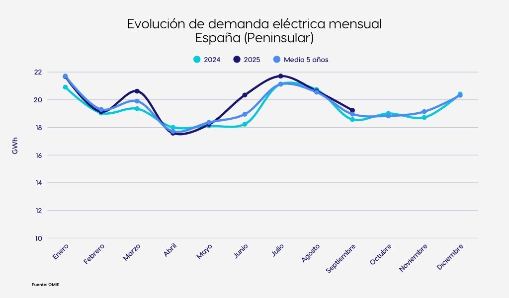 La demanda eléctrica peninsular fue de 18.573 GWh, una caída del 10,4 % respecto a agosto y un valor ligeramente superior (+1,9 %) a la media de los últimos cinco años.