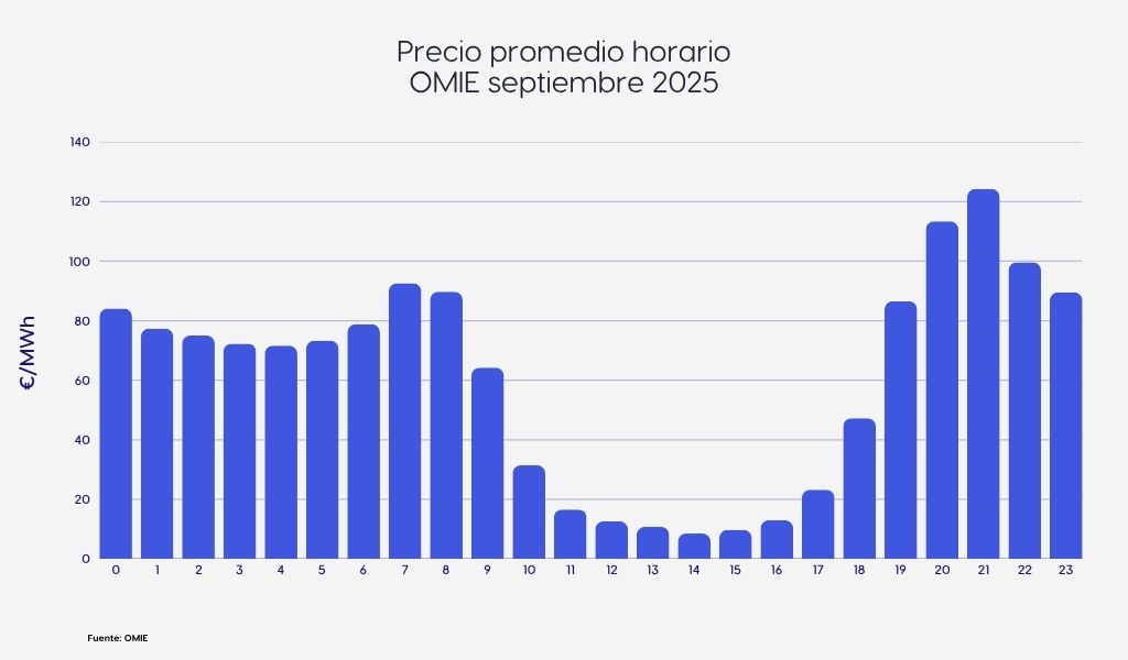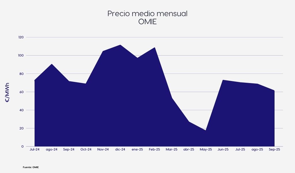 El precio medio del mercado diario en España durante septiembre ha sido de 61,04 €/MWh, un 10,8 % inferior al registrado en agosto (68,44 €/MWh) y un 14,3 % por debajo del valor observado en septiembre de 2024 (71,27 €/MWh).